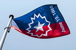 The colors are based off the American flag—red, white and blue—to share that the people freed in Texas were American citizens.