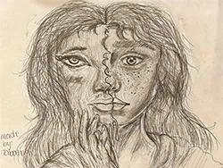 “I was inspired by the idea of masking one’s true self behind strength and resilience. Like the protagonist, I have struggled with identity and the pressure to be 'unbreakable.' This led me to write a poem titled 'Unmasking Myself,' which intertwines the main character’s story with my own,” said Davage in her written artist’s statement. “I often felt like I had to hide my true identity behind a false persona because I was adopted around five days old, and never knowing what I am or who I am really destroyed my identity, because I didn't know who I was. Jess's story showed me that I was not alone and provided different ways to cope or deal with my struggles.”
